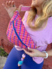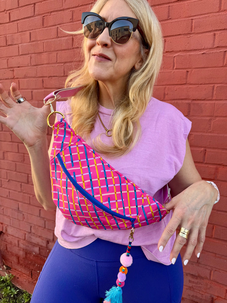 The perfect crossbody on the go! Fanny pack style but made to wear crossbody. measures 14” at the longest part and 8” tall in the middle.