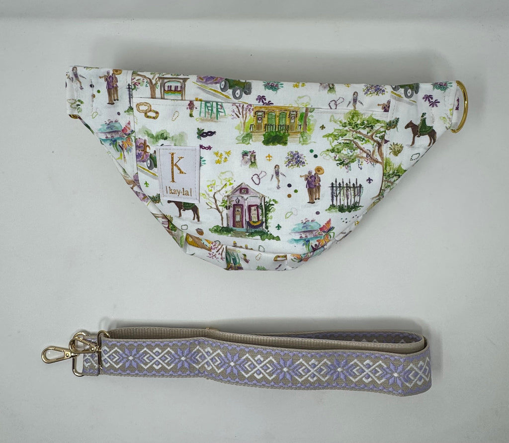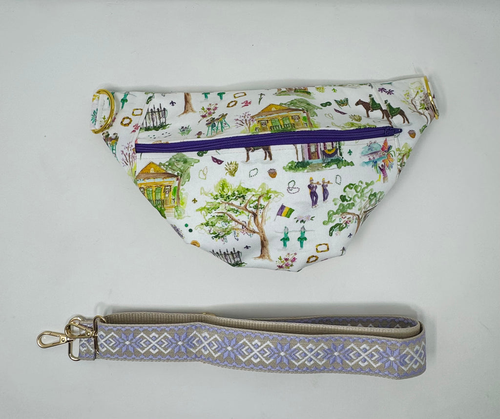The perfect crossbody on the go! Fanny pack style but made to wear crossbody. measures 14” at the longest part and 8” tall in the middle.