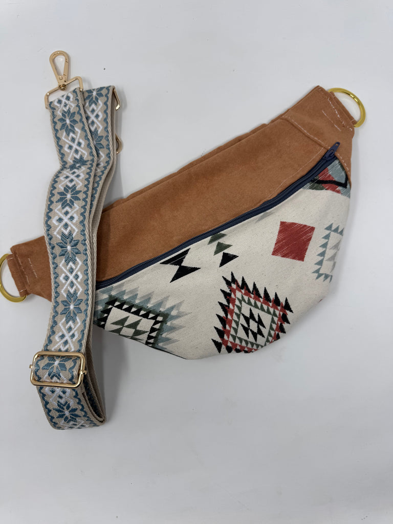 The perfect crossbody on the go! Fanny pack style but made to wear crossbody. measures 14” at the longest part and 8” tall in the middle.