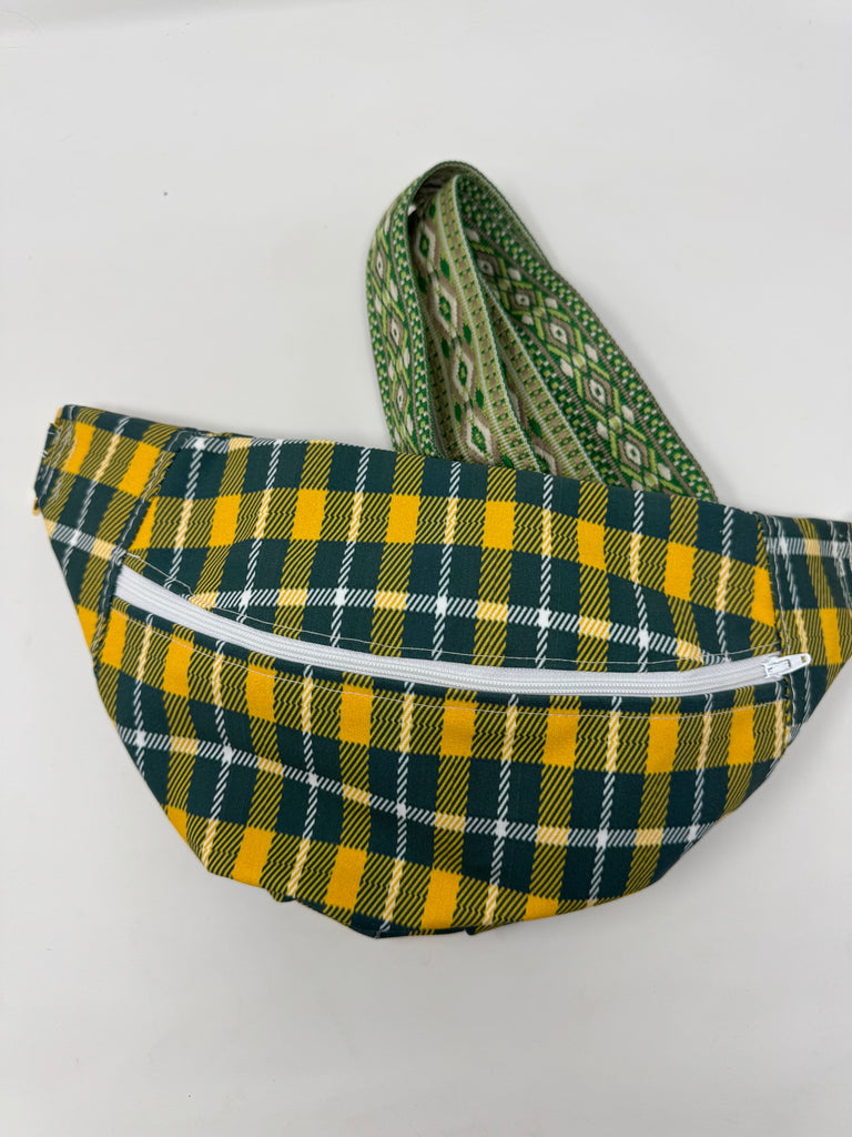 The perfect crossbody on the go! Fanny pack style but made to wear crossbody. measures 14” at the longest part and 8” tall in the middle.