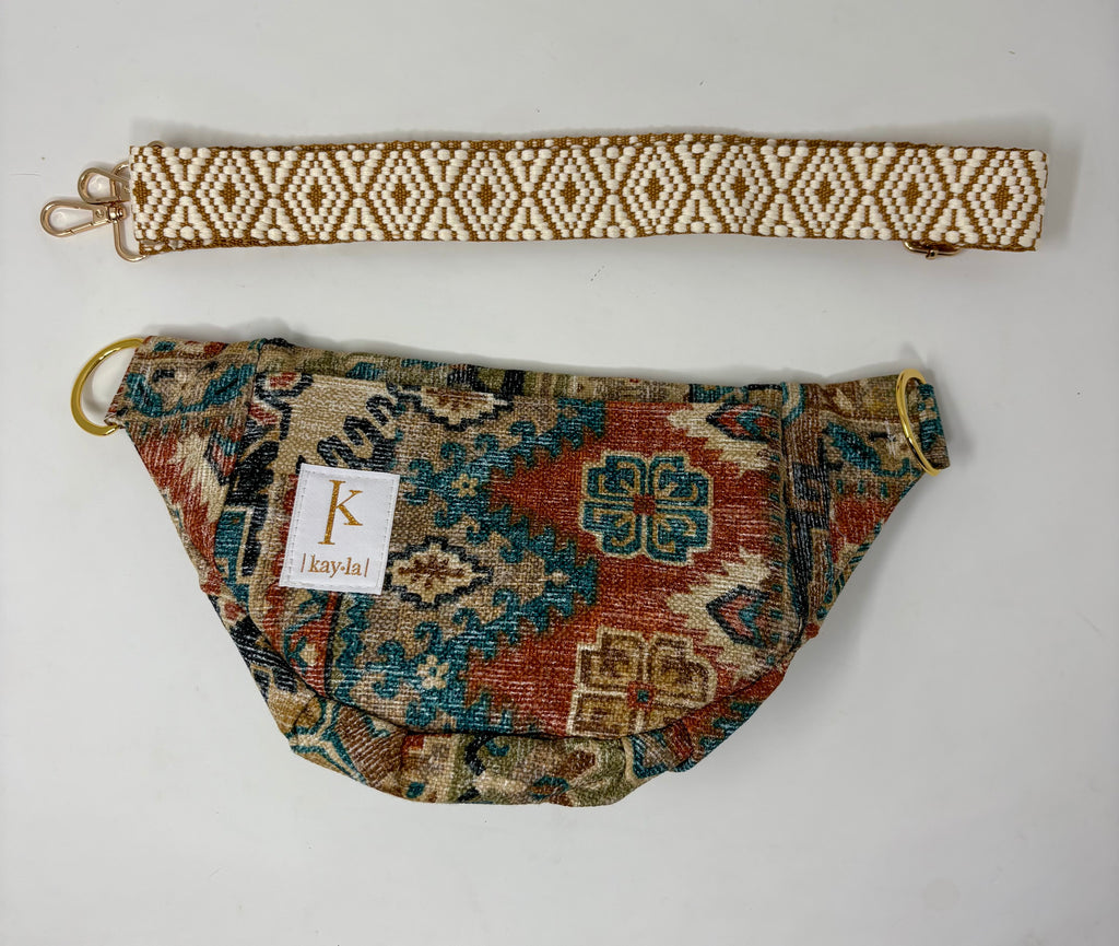 The perfect crossbody on the go! Fanny pack style but made to wear crossbody. measures 14” at the longest part and 8” tall in the middle.