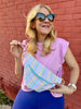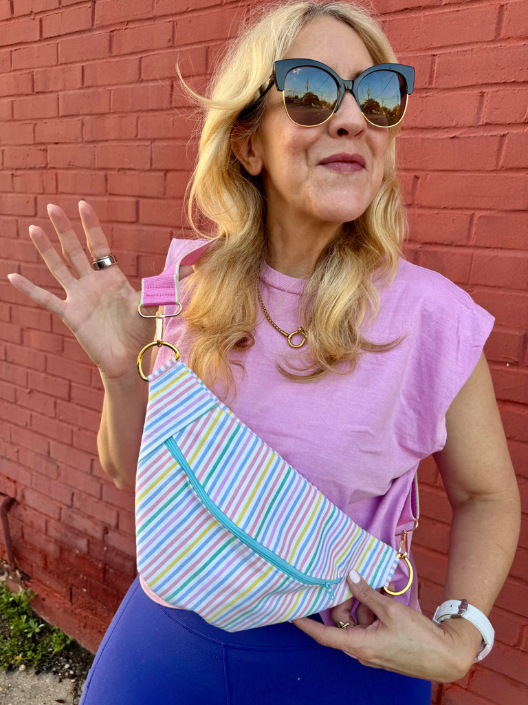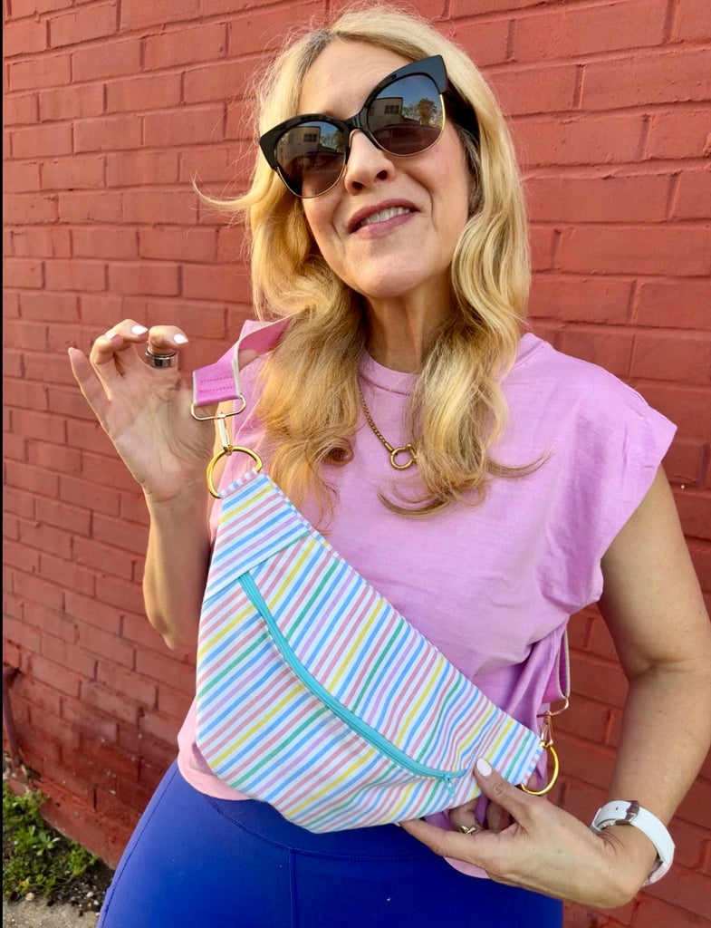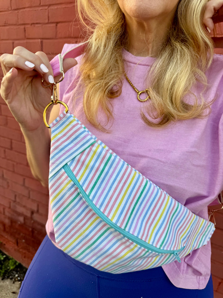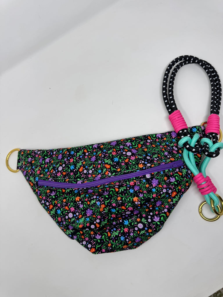 The perfect crossbody on the go! Fanny pack style but made to wear crossbody. measures 14” at the longest part and 8” tall in the middle.