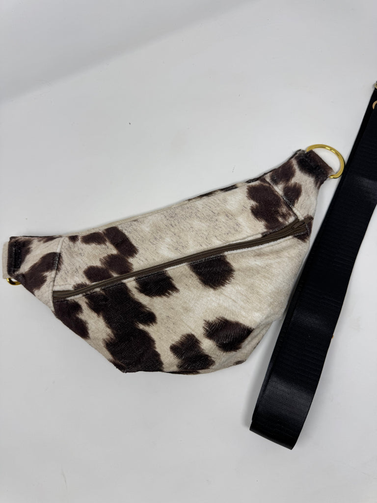 The perfect crossbody on the go! Fanny pack style but made to wear crossbody. measures 14” at the longest part and 8” tall in the middle.