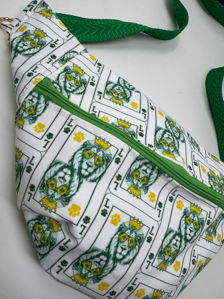 The perfect crossbody on the go! Fanny pack style but made to wear crossbody. measures 14” at the longest part and 8” tall in the middle.